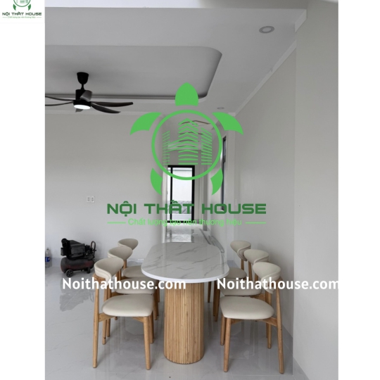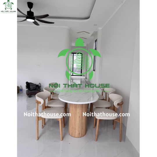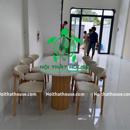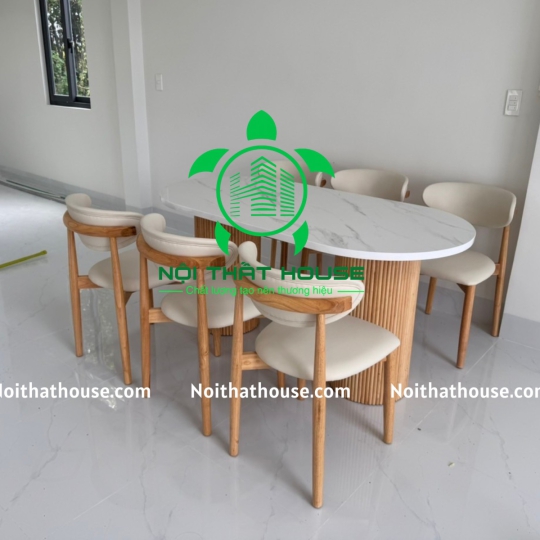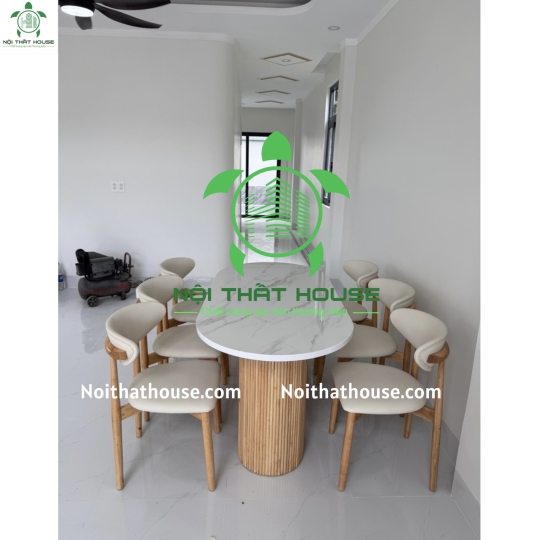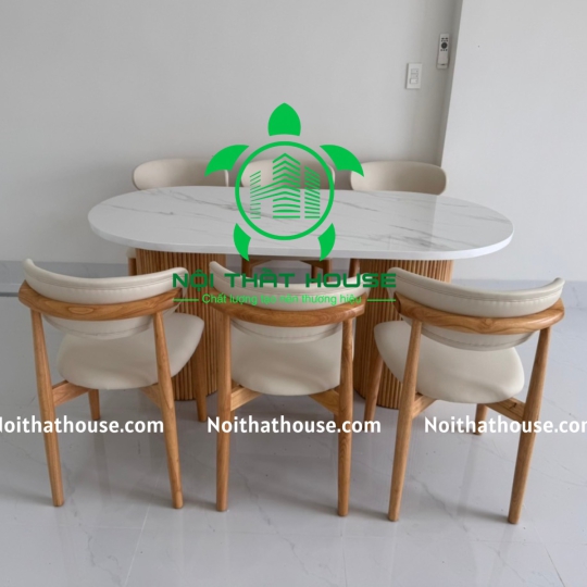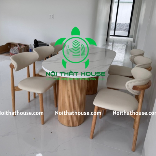 Ghế NEVA TỰA TRĂNG. Gỗ Cao su 100% (bọc đệm Simili Trắng sữa Rất êm ái), bọc đệm theo yêu cầu Bàn đá 1m6x800x740 đặc biệt dày 30mm, mặt đá trắng bóng chống ố, chống trầy xước và chống thấm nước ạ, chân gỗ Cao su.